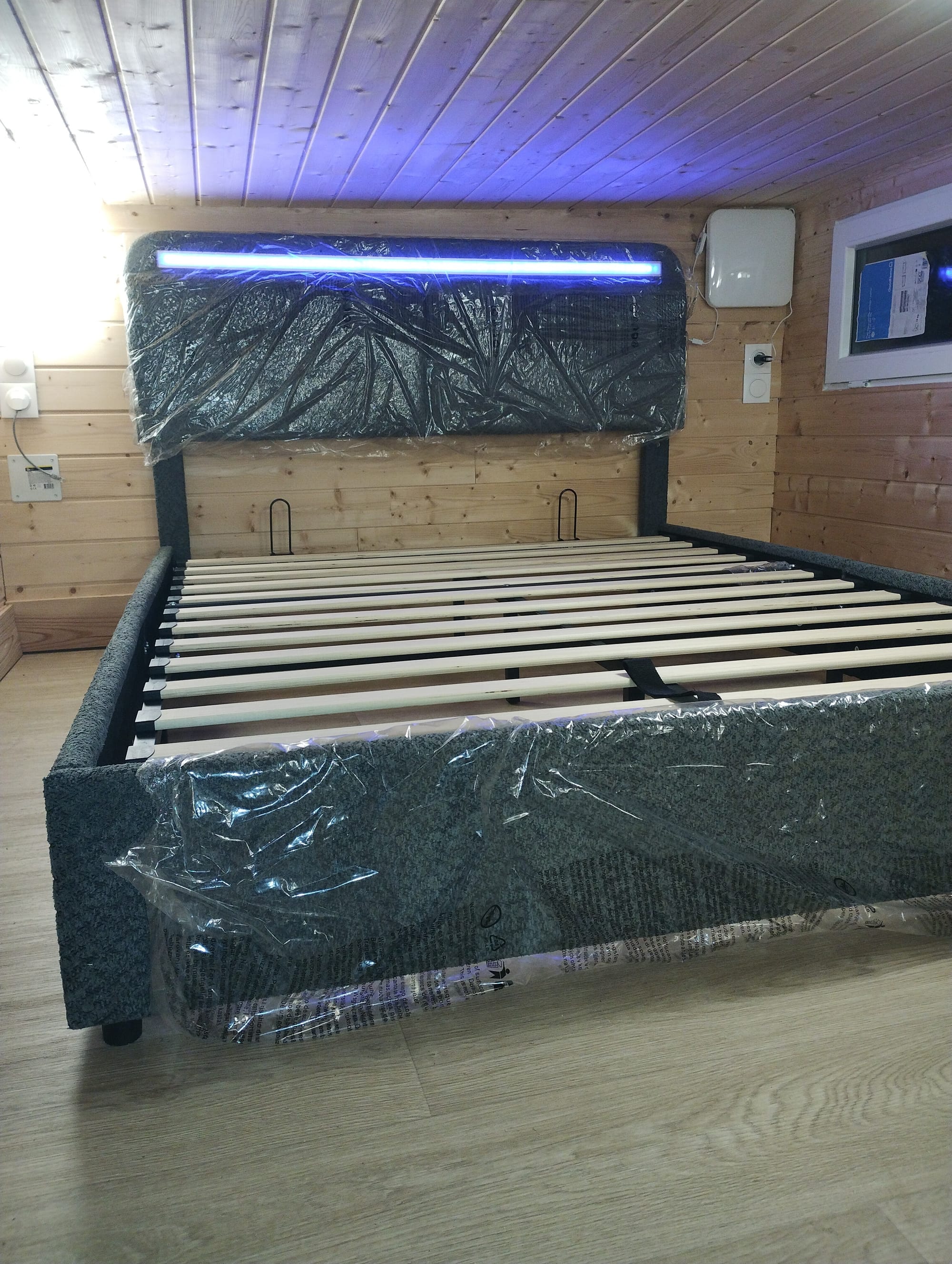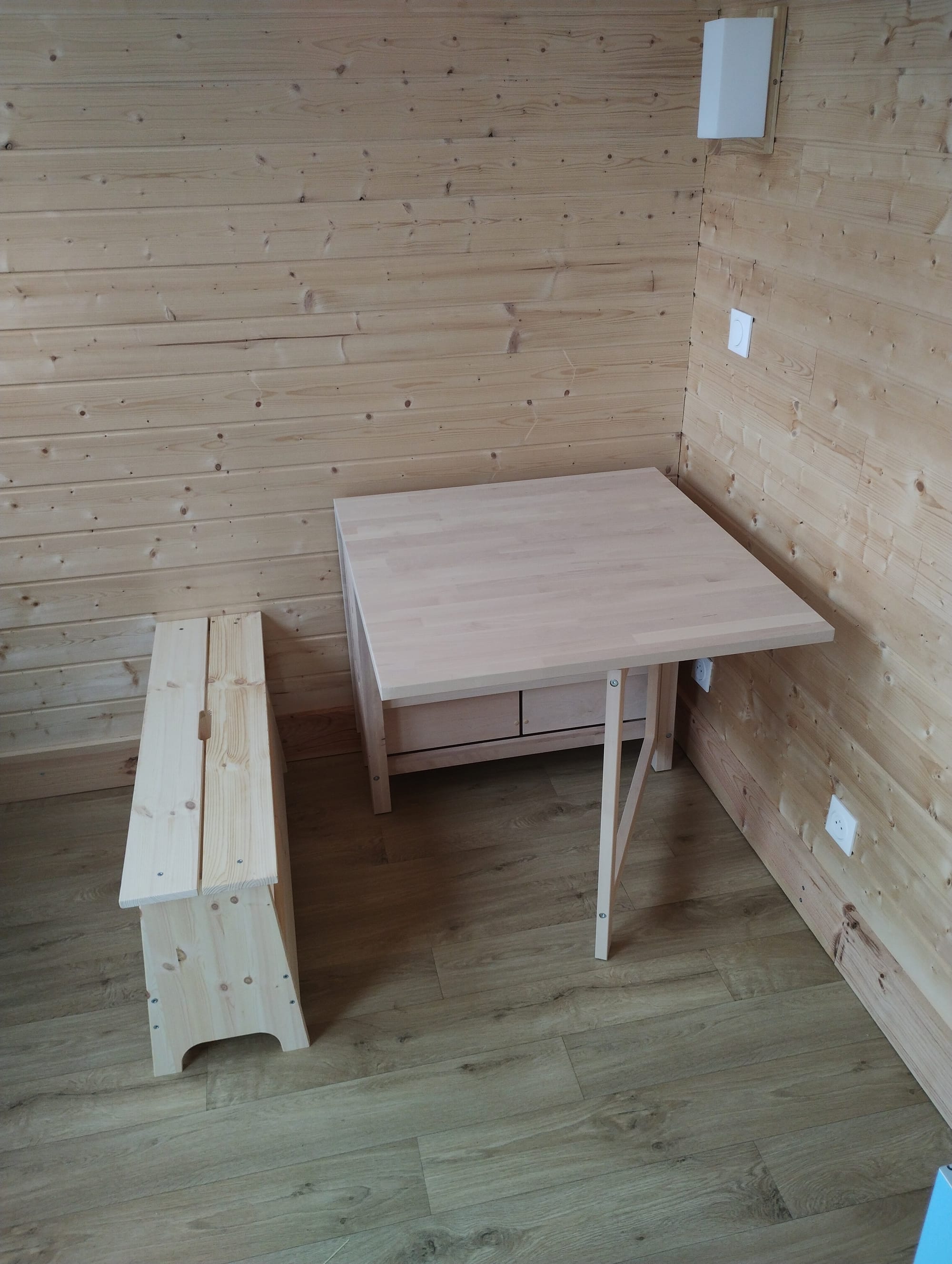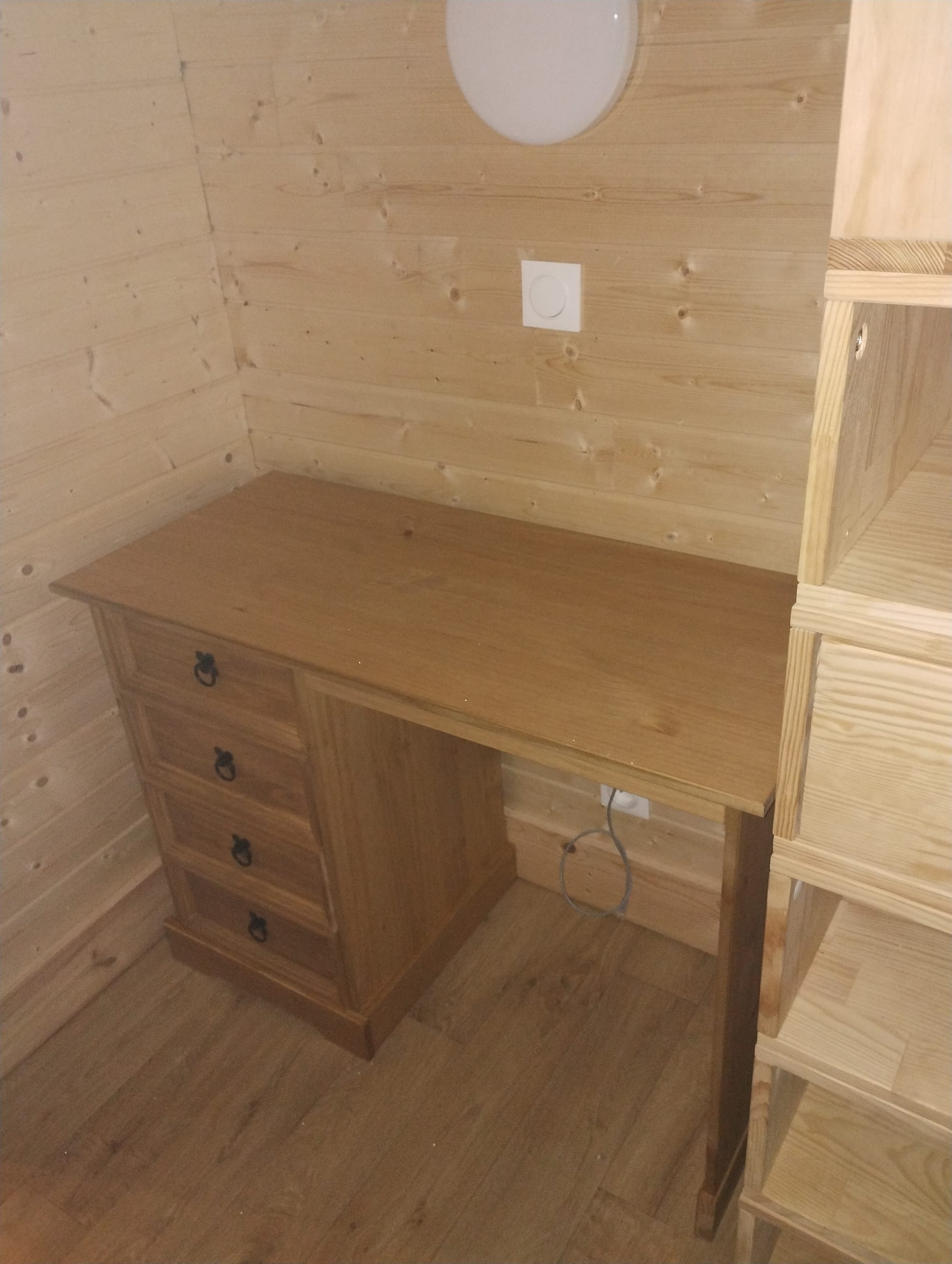 - Taille extérieure: 6,7x 2.5x4.3 (6.7 m sans le timon)avec 2 essieux 3.5 T; - Surface intérieure: 24 m2 environ; - Bardage bois autoclavé vert à l'extérieur et lambris sapin-épicéa à l'intérieur: - Luminosité accrue avec 8 fenêtres au niveau des mezzanines, porte d'entrée vitrée, grande fenêtre au niveau du salon et fenêtre au dessus du plan de travail de la cuisine: - Salle de bain: wc suspendu, douche à l'Italienne, meuble lave-main, cumulus; - Coin cuisine: Plan de travail, évier double avec robinet et douchette, rangements haut et bas. colonne, plaque de cuisson mixte(gaz et électrique) ; - Coin salon (canapé fourni), table pliante et banc; - Coin Bureau (fourni); - Coin couchage: 2 grandes mézzanines de 4 m2 chacune, lit coffre 140x190 (matelas non fourni); - Meuble escalier-rangement (accès mezzanines): - Climatisation réversible. - Electricité faite (tableau électrique, nombreuses prises, éclairage) Prix: 49999 Euros au départ.